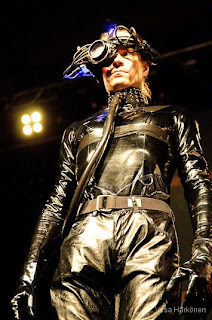 Latex & Leather - This one is the most accepted aesthetics. Although more people asigned this way was interfered by Matrix, this aesthetic had been included in old films. This kind of aesthetic comes to BDMS culture. In general these latex or leather overralls mixed with militar boots or high heeled plataform shoes. Sometimes have been added small silver spikes in pads. The hair is usually short, bob cut or a very symmetrical and linear (the guys simply prefer short hair combed back and dyed bright colors, as in Blade Runner). The look is finished off with black make up in the eyes (you can even do a line that hand, like Marilyn Manson) and red lips, in the case of girls. The glasses are usually fine. Can often be like Cyclop in X Men (given the fact that only a glass without separation) or outdoor sunglasses, rimless.
